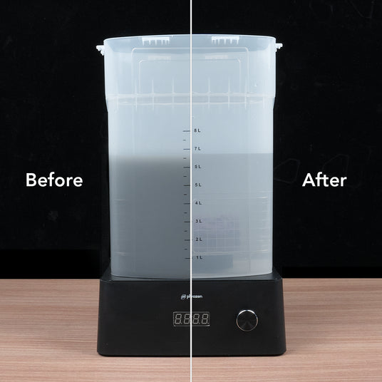 經Phrozen內部測試,過濾後的95%酒精仍可正常用於模型清洗, 且清潔效果不會因為重複過濾而明顯下降。