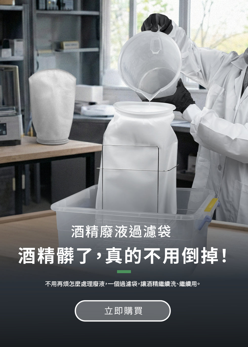 使用「酒精廢液過濾袋」,將混濁無法繼續清潔的酒精廢液進行過濾。